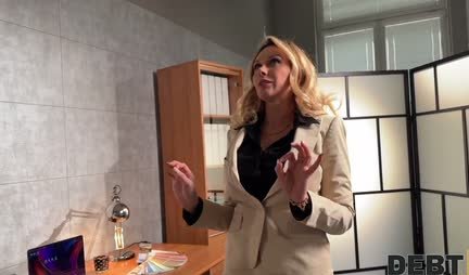 Знаете чем чреваты кредиты? Тем что берешь чужие и на время, а отдаешь свои и навсегда. К сожалению вот эта симпатичная грудастая служащая ни разу не знала об этом, поэтому, когда к ней пришли за долгом из коллекторского агентства, она спряталась под стол, а когда мужик ее все же нашел, она в знак сатисфакции сделала ему минет и знатно перепихнулась прям в офисе. И если бы она так же занималась продажной любовью, то думается, кредит бы ей не был нужен вообще!